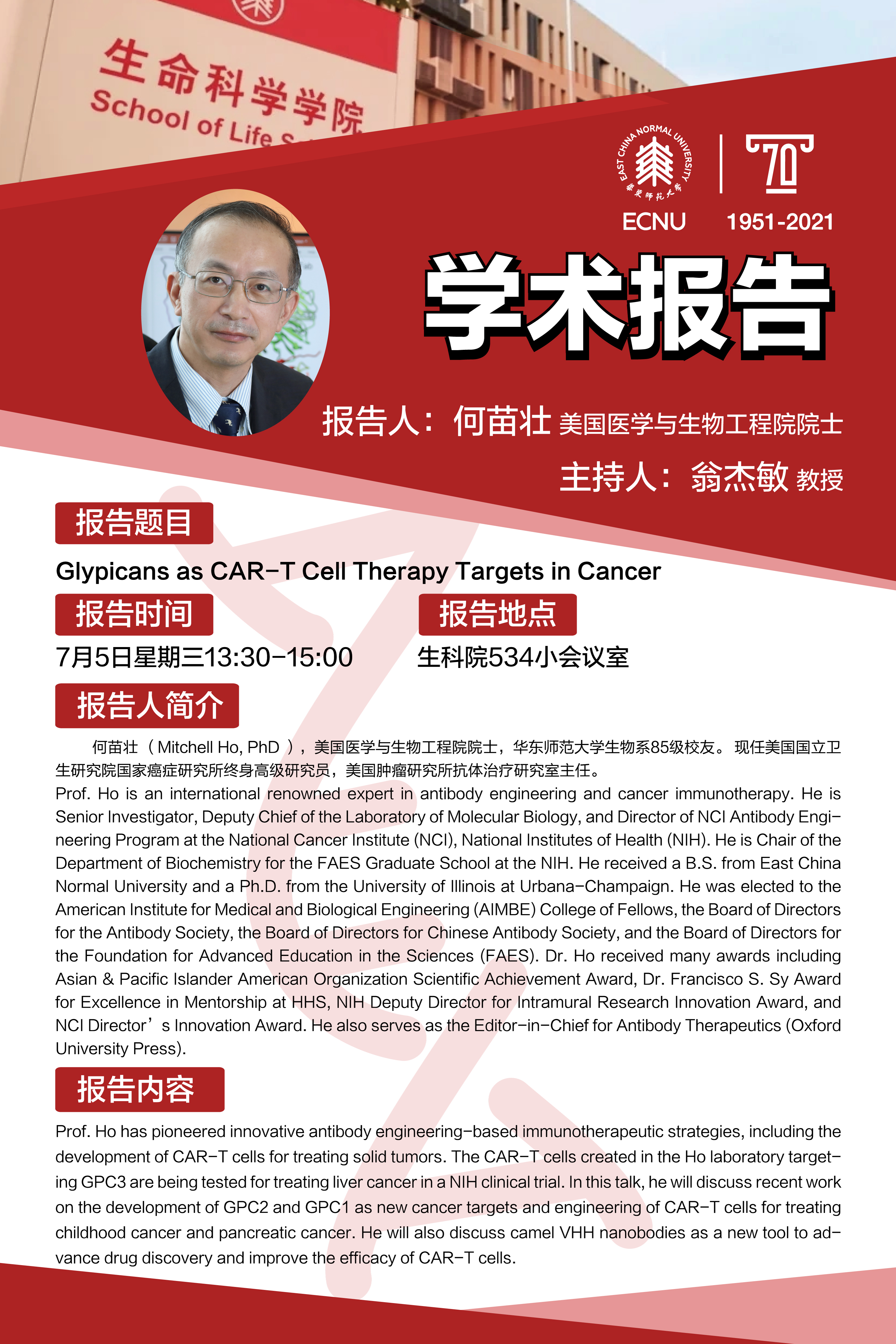 何苗壮 (Mitchell Ho, Phd),美国医学与生物工程院院士,华东师范大学生物系85级校友。 现任美国国立卫生研究院国家癌症研究所终身高级研究员,美国肿瘤研究所抗体治疗研究室主任。