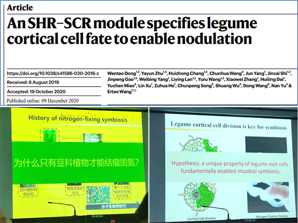 值得一提的是,继2017年在国际顶级期刊Science上发表关于“脂肪酸是植物与菌根真菌共生体系中碳源的主要传递形式”的重大发现3年后,于此次报告前一天20201210日,王二涛研究员课题组在国际顶级期刊Nature上发表Article成果,研究揭示豆科植物皮层细胞获得SHR-SCR干细胞分子模块,使其有别于非豆科植物,从而回答了共生领域的另一世纪难题:“为什么只有豆科植物能与根瘤菌截瘤固氮”。本次报告中,与会老师和同学随着王老师的讲解,共同体会了这项成果发现过程中的起承转合以及8年不懈努力背后的趣事。