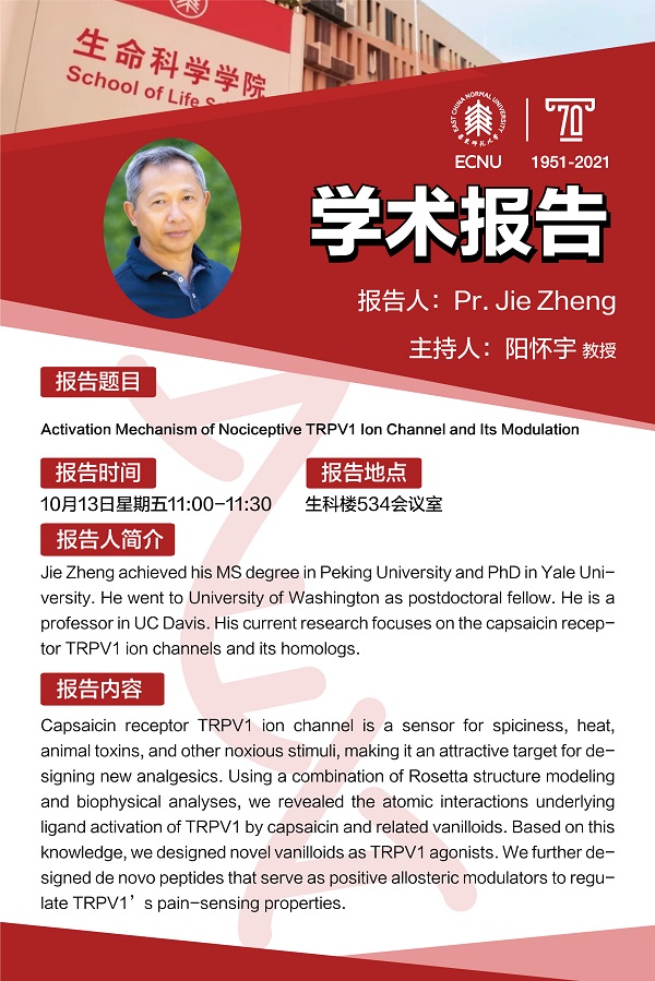 Jie Zheng achieved his MS degree in Peking University and PhD in Yale University. He went to University of Washington as postdoctoral fellow. He is a professor in UC Davis. His current research focuses on the capsaicin receptor TRPV1 ion channels and its homologs.