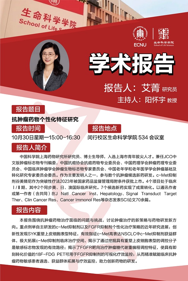 中国科学院上海药物研究所研究员、博士生导师,入选上海市青年拔尖人才。兼任JCO中文版肿瘤标志物专刊编委,中国抗癌协会抗癌药物专业委员会、中国药理学会肿瘤药理专业委员会、中国临床肿瘤学会肿瘤生物标志物专家委员会、中国老年学和老年医学学会肿瘤基础及转化研究专家委员会委员。作为主要发明人之一,参与数个抗肿瘤候选新药研发。c-Met抑制剂谷美替尼作为突破性疗法2023年被国家药品监督管理局附条件获批上市。4个项目处于临床Ⅰ/Ⅱ期,其中2个同步美、日、澳国际临床研究。7个候选新药实现了成果转化。以通讯作者或第一作者(含共同)在J Natl Cancer Inst、Hepatology、Signal Transduct Target Ther、Clin Cancer Res、Cancer Immonol Res等杂志发表SCI论文70余篇。