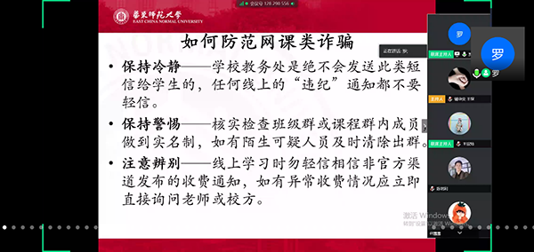 因受疫情影响,全国各地都推迟了开学,虽然大部分同学们还未返校,然而骗子早已“复工”,为保证学生们的个人安全及财产安全,罗宗才老师为大家展开了“防疫勿忘防骗”的安全教育。罗老师首先分析了近两年来我校诈骗案的情况,受骗金额之高为大家敲响警钟。罗老师重点为同学们罗列剖析了各类诈骗套路,虚假售卖口罩类诈骗,“退改签”骗局、网课类诈骗、刷单类诈骗、电信诈骗都是疫情期间常见的诈骗手段。针对以上各类诈骗套路,罗老师还整理提供了详细的防骗指南,给出了许多有用的建议,有效的帮助同学们知悉诈骗手段,避免上当受骗。