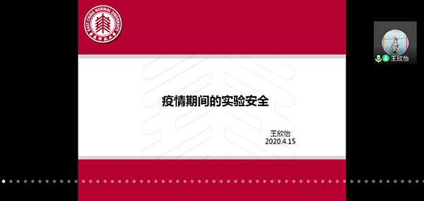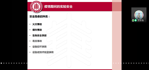 虽然防疫在家中,实验室安全不放松!疫情期间实验室安全教育由2018级硕士、王欣怡同学展开。作为第三届“啄木鸟”安全小卫士骨干成员,她对实验室安全有着深刻理解。她认为不少同学对实验室安全的重视程度不够高,并通过契合同学实际的惨烈案例让同学们明白实验室安全无小事。她表示疫情期间实验室不同于往常,主要表现为“空”“旷”,在这样的条件下实验室容易存在火灾事故、爆炸事故、生物安全事故、毒害事故、设备损坏事故、设备或技术被盗事故等隐患。针对这些隐患,她展开了详细的讲解,告知同学们如何避免及应对这些问题。最后,她还分享了疫情结束返校后的实验室安全相关知识,提前帮助同学们在返校后能够做到安全、有效率地推进实验室工作。