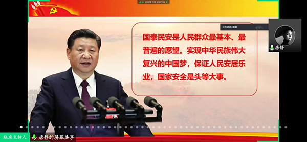 唐静老师为我们带来了主题为“总体国家安全观和新时代国家安全”的报告。她首先简单地介绍了全民国家安全教育日,然后从几个重要的国际事件引入,为同学们详细说明了何为安全,何为国家安全,并介绍了当今大国国家安全观。接着她从“新中国成立以来国家安全观的历史演变”、“当前中国国家安全形势的变化”、“当前国家安全战略的新思考”三个方面对中国国家安全观展开了详细的讲述。唐静老师的介绍加深了同学们对国家安全的理解,在认真学习国家安全知识的同时,也让同学们明白所承担的重要责任:国家安全,青年争先。应自觉做祖国安全的维护者。