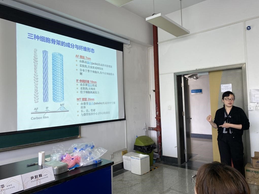 细胞荧光标记是利用荧光染料作为标志物对研究细胞进行标记的分析方法。在副教授任华和工程师尹尉翰两位老师的指导下,学员们完成了用荧光探针标记细胞微丝和细胞核的实验,当看到荧光显微镜下一张张充满着科幻感的照片,大家的成就感和欣喜之情溢于言表。
