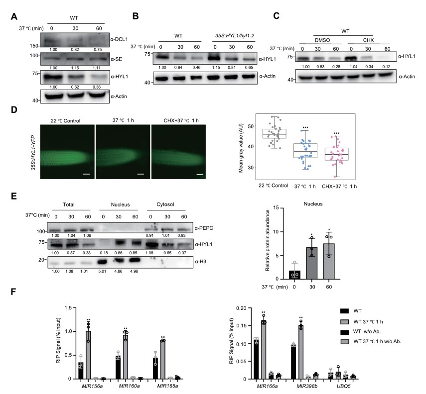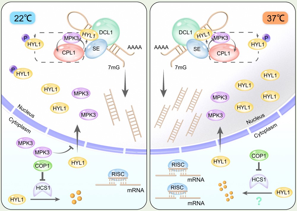 该研究工作发现,热胁迫条件下,大多数miRNA表达上调,植物可以通过全局调控miRNA加工过程来应答高温胁迫。虽然miRNA加工复合体关键因子HYL1的总蛋白量在高温下减少,但其核内定位增加,从而增强了与pri-miRNA的结合,促进成熟miRNA的生成。进一步研究表明,激酶MPK3与磷酸酶CPL1通过动态调控HYL1的磷酸化状态,影响其核质分布及植物耐热性。该研究阐明了植物通过调控miRNA加工复合体应答热胁迫的新机制。
