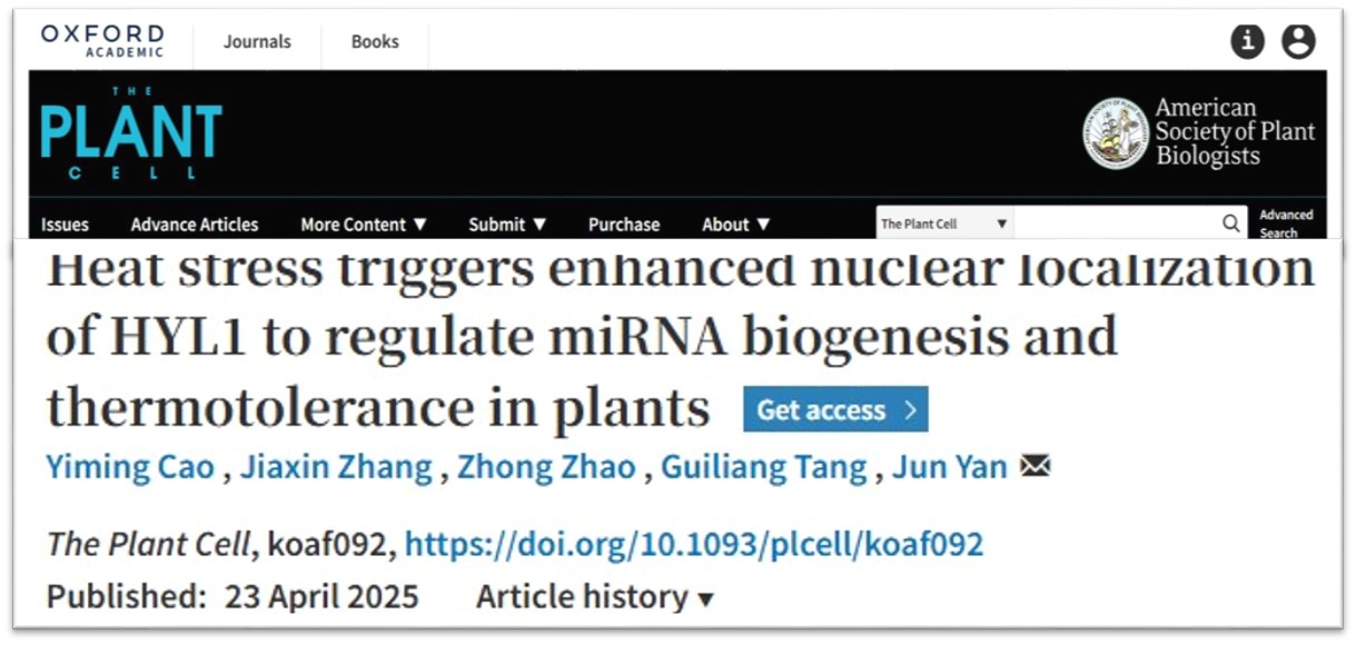 2025年4月23日,华东师范大学生命科学学院晏军课题组在国际著名期刊The Plant Cell在线发表题为“Heat stress triggers enhanced nuclear localization of HYL1 to regulate miRNA biogenesis and thermotolerance in plants”的研究论文。该研究是课题组2023年发表于The Plant Cell的成果“The miR165/166–PHABULOSA module promotes thermotolerance by transcriptionally and post-translationally regulating HSFA1”的延续。两项工作系统揭示了植物通过小分子RNA及其加工复合体响应高温胁迫的分子机制,不仅深化了人们对植物耐热性的理论认知,还为培育耐高温作物提供了关键分子靶点。