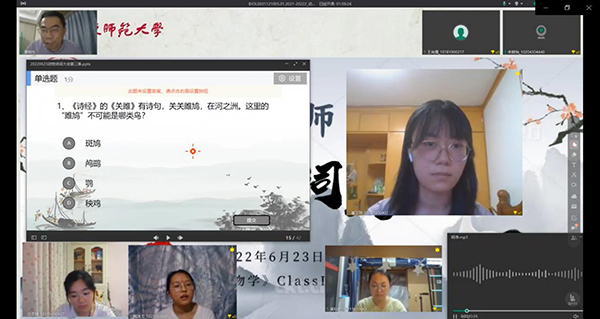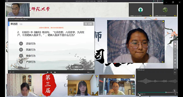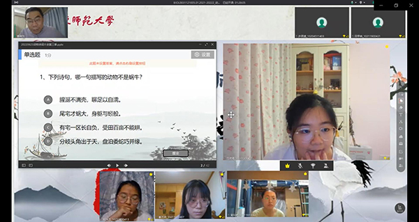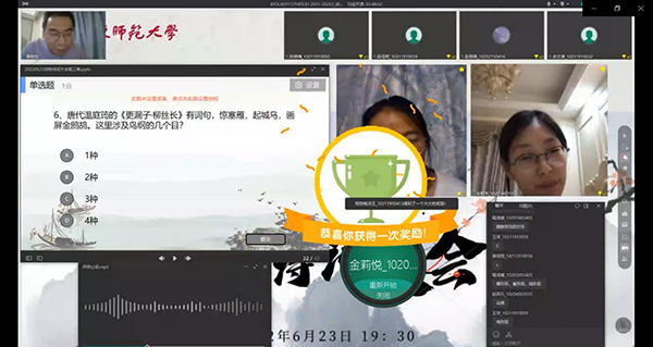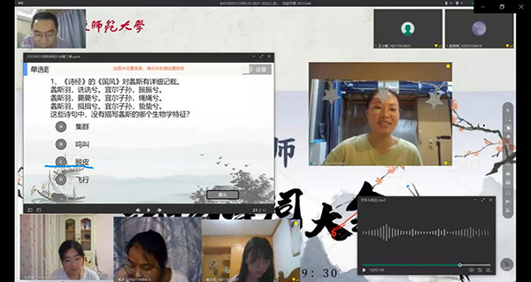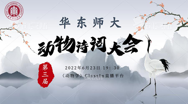 2022年6月23日晚上,生命科学学院综合利用ClassIn平台和雨课堂工具,举办了华东师大第三届动物诗词大会。动物学课程负责人姜晓东老师设计、策划并主持了本届诗词大会,来自生命科学学院、教育学部、生态与环境学院、地理科学学院、化学与分子工程学院等院系的百余名学生参加。