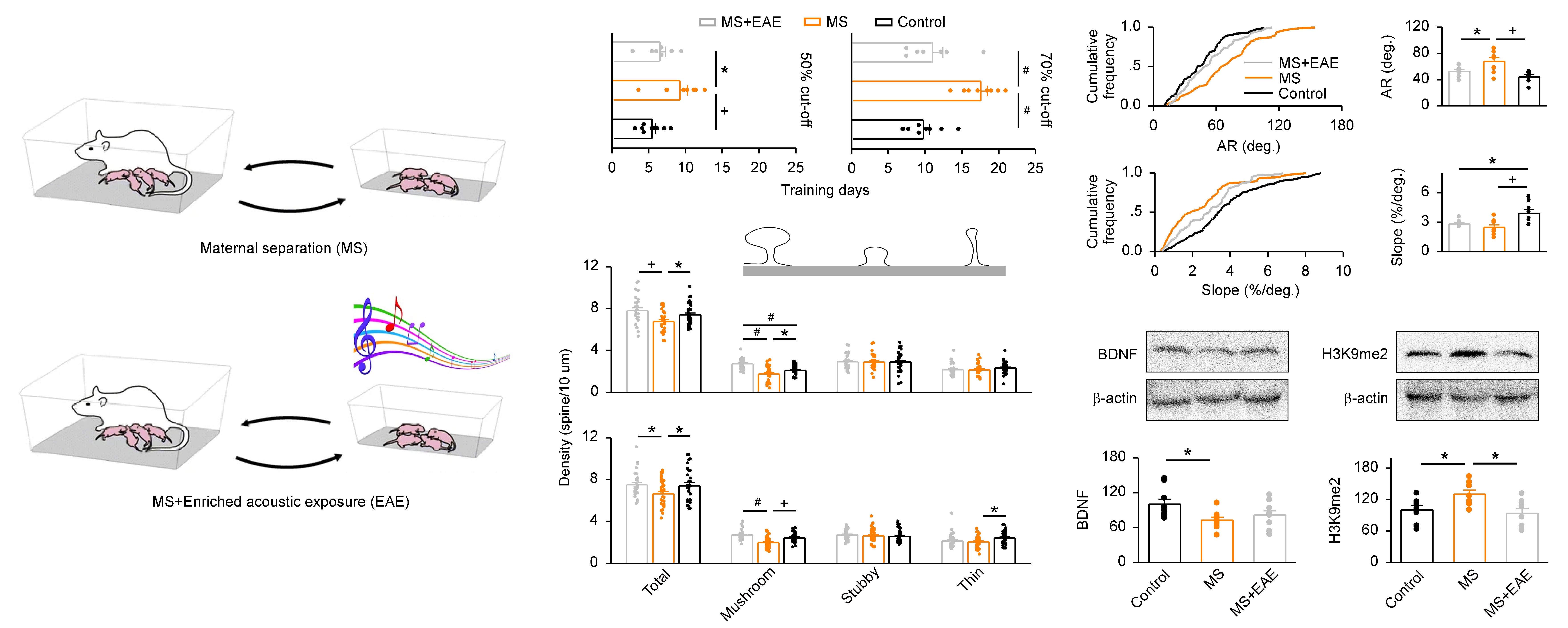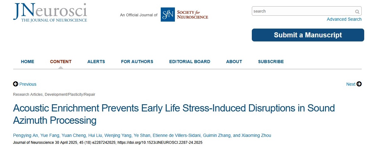 近期,华东师范大学生命科学学院、脑功能基因组学教育部重点实验室周晓明教授课题组在神经科学顶级期刊《Journal of Neuroscience》上发表题为“Acoustic enrichment prevents early life stress-induced disruptions in sound azimuth processing”的研究论文,系统揭示了早期应激影响听觉的皮层机制,并创新性地提出丰富声暴露的干预策略。研究发现,类似母婴分离的早期应激导致动物成年后声分辨能力的显著下降,同时伴随脑听觉皮层神经元声调谐功能受损,以及神经元树突分支复杂性和树突棘密度的降低。值得注意的是,研究首次证实,在应激期同时配对丰富声刺激干预可以明显缓解应激效应,使动物的听觉行为表现、皮层神经元功能特性和突触结构恢复至接近正常水平。深入的机制研究表明,这些多层次的改善效应可能与脑源性神经营养因子表达的表观遗传调控机制密切相关。