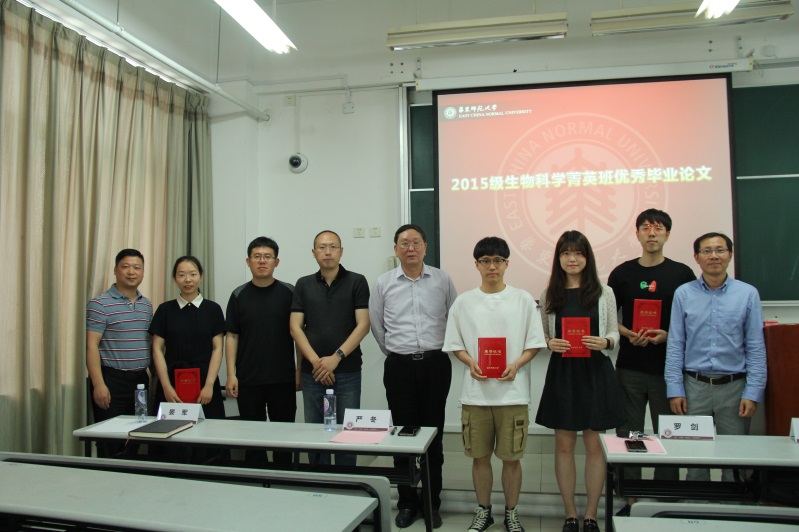 2019年5月22日下午13:30, 2015级生物科学菁英班本科毕业论文公开答辩会在四教顺利举行。作为华东师范大学首届菁英班的毕业论文答辩,学校和学院都对此给予了高度重视。学校教务处主管菁英班工作的副处长谭红岩老师,生命科学学院党委书记党远鸿老师分别作为学校和学院的代表出席了答辩会。生命科学学院副院长江文正教授、生物化学与分子生物学学科罗剑教授、动物学科杨嘉龙研究员、植物学科晏军研究员,中科院生化细胞所胡红雨研究员、中科院植物生理生态研究所严冬研究员共同组成此次本科毕业论文答辩委员会,学院教务金靖老师,菁英班专职辅导员李初旭老师作为嘉宾参加了此次答辩会。经过整个下午智慧与思维的碰撞,2015级生物科学菁英班21位同学均顺利通过了答辩,精彩展示了本科阶段的科研训练成果。