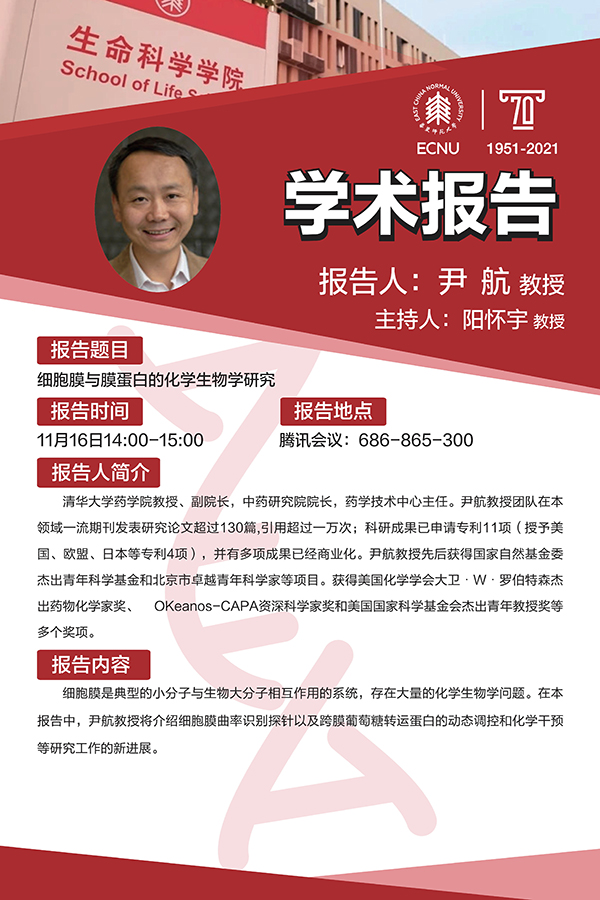 细胞膜是典型的小分子与生物大分子相互作用的系统,存在大量的化学生物学问题。在本报告中,尹航教授将介绍细胞膜曲率识别探针以及跨膜葡萄糖转运蛋白的动态调控和化学干预等研究工作的新进展。