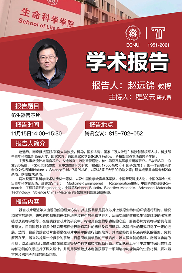 赵远锦,南京鼓楼医院/东南大学教授,博导,国家杰青、国家“万人计划”科技创新领军人才,科技部中青年科技创新领军人才,国家优青,英国皇家化学会(RSC) Fellow,科技部重点专项首席科学家。 主要从事微流控与器官芯片、人造器官、药物智能递送、仿生界面及其医学应用等研究。已发表SCI 论文380余篇,IF之和大于5000,其中260篇IF大于10,被引用17500余次(H 因子为70);第一作者/通讯作者论文包括9篇Nature / Science子刊、7篇PNAS、以及43篇IF大于20的论文等;研究成果共申请专利200余项,获授权70余项。 两次获得军队科学技术进步奖一等奖、以及中国化学会青年化学奖、中国新锐科技人物、中国化学会-杰出青年科学家奖项。受聘为Smart Medicine和Engineered Regeneration主编,中国科协旗舰刊Research、工程院院刊Engineering、中科院Science Bulletin、Bioactive Materials、Advanced Materials Technology、Science China-Materials等权威期刊副主编或编委。