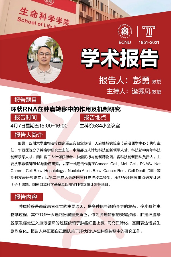 肿瘤转移是癌症患者死亡的主要原因,是多种信号通路介导的复杂、多步骤的生物学过程,其中TGF-β通路扮演重要角色。作为肿瘤转移的关键步骤,肿瘤细胞挣脱原发病灶进入血液循环的过程依赖于肿瘤细胞上皮-间充质转化,基因表达谱发生剧烈变化。报告人将汇报自己团队关于环状RNA在肿瘤转移中的研究工作。
