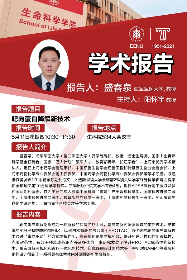 盛春泉,海军军医大学(第二军医大学)药学院院长、教授、博士生导师。国家杰出青年科学基金获得者、国家“万人计划”领军人才、教育部青年“长江学者”、上海市优秀学术带头人。担任上海市药学会副理事长、中国细胞生物学会细胞工程和转基因生物分会副会长、上海市药物化学专业委员会副主任委员、中国药学会药物化学专业委员会委员等学术职务。以通讯作者发表170余篇国际期刊论文,入选斯坦福大学全球前2%顶尖科学家终身科学影响力榜单和全球顶尖前10万科学家榜单。主编出版中英文学术专著4部,担任APSB执行副主编以及多种国际期刊编委。作为主要完成人获得中国科协“求是”杰出青年科学奖、国家科技进步二等奖、上海市科技进步二等奖、教育部自然科学一等奖、上海市药学科技奖一等奖、药明康德生命化学研究奖、上海市青年科技英才等学术奖励。