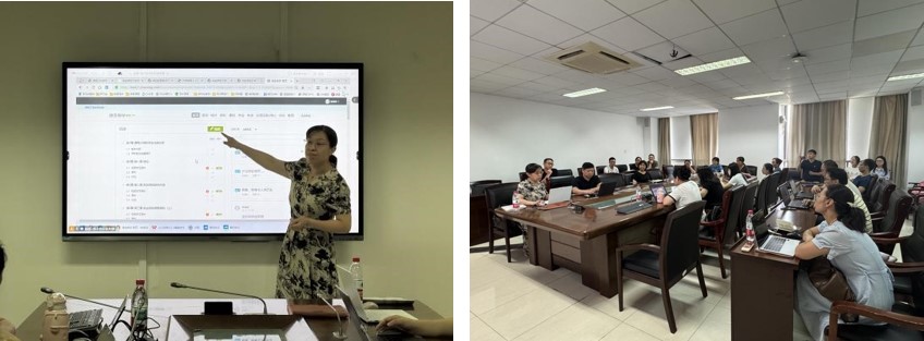 会议伊始,张美玲老师介绍了参与本次建设的课程情况。来自超星泛雅集团的胡子琦老师全面展示了智慧课程建设的基本流程,以及线上学习平台和门户网站信息。胡老师介绍,该平台基于教师提供的教学信息和AI辅助工具,为生物专业提供一站式数字化教学方案。其核心功能包括:知识图谱、能力图谱、问题图谱、思政图谱和课程数据统计等。此外,胡老师结合国内其他高校的案例,展示了教师在智慧课程建设过程中的主要工作内容、时间节点和线上平台使用方法,并梳理了从课程建设、专业建设到院级门户设计的推进方案。