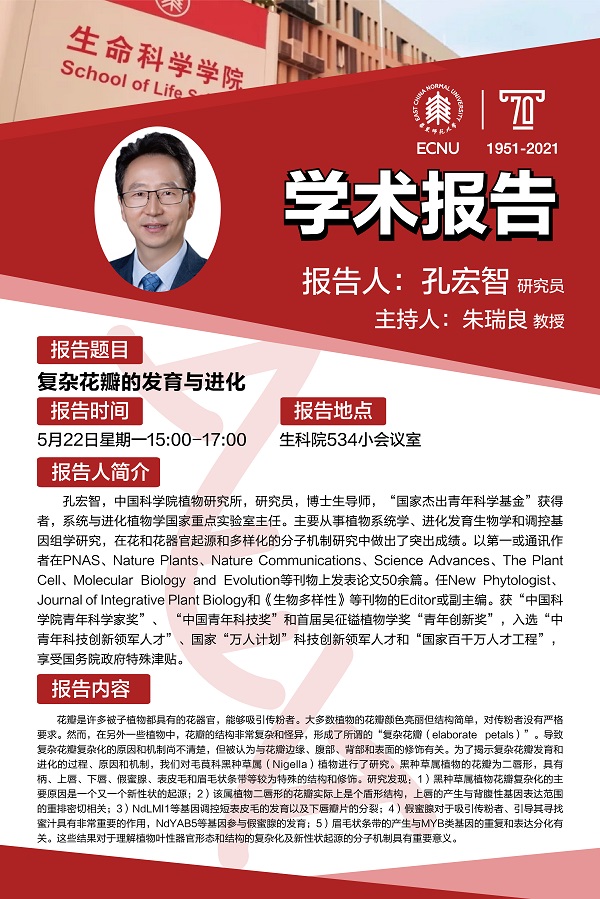 孔宏智,中国科学院植物研究所,研究员,博士生导师,“国家杰出青年科学基金”获得者,系统与进化植物学国家重点实验室主任。主要从事植物系统学、进化发育生物学和调控基因组学研究,在花和花器官起源和多样化的分子机制研究中做出了突出成绩。以第一或通讯作者在PNAS、Nature Plants、Nature Communications、Science Advances、The Plant Cell、Molecular Biology and Evolution等刊物上发表论文50余篇。任New Phytologist、Journal of Integrative Plant Biology和《生物多样性》等刊物的Editor或副主编。获“中国科学院青年科学家奖”、 “中国青年科技奖”和首届吴征镒植物学奖“青年创新奖”,入选“中青年科技创新领军人才”、国家“万人计划”科技创新领军人才和“国家百千万人才工程”,享受国务院政府特殊津贴。