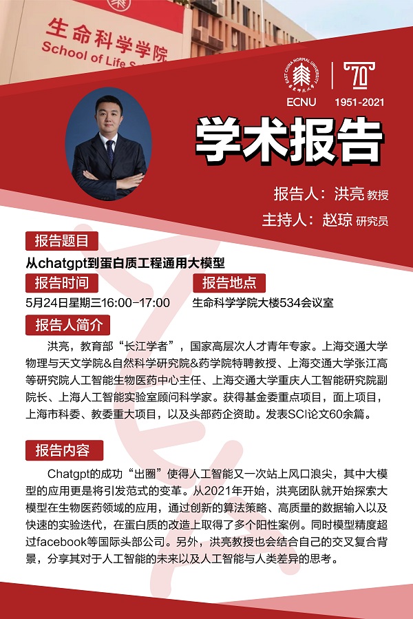 Chatgpt的成功“出圈”使得人工智能又一次站上风口浪尖,其中大模型的应用更是将引发范式的变革。从2021年开始,洪亮团队就开始探索大模型在生物医药领域的应用,通过创新的算法策略、高质量的数据输入以及快速的实验迭代,在蛋白质的改造上取得了多个阳性案例。同时模型精度超过facebook等国际头部公司。另外,洪亮教授也会结合自己的交叉复合背景,分享其对于人工智能的未来以及人工智能与人类差异的思考。