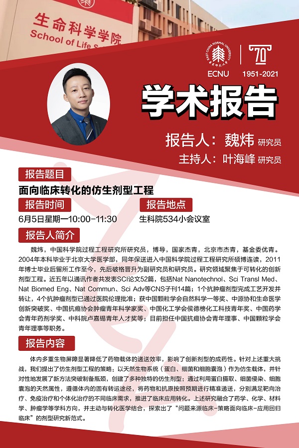 魏炜,中国科学院过程工程研究所研究员,博导,国家杰青,北京市杰青,基金委优青。2004年本科毕业于北京大学医学部,同年保送进入中国科学院过程工程研究所硕博连读,2011年博士毕业后留所工作至今,先后破格晋升为副研究员和研究员。研究领域聚焦于可转化的创新剂型工程。近五年以通讯作者共发表SCI论文52篇,包括Nat Nanotechnol、Sci Transl Med、Nat Biomed Eng、Nat Commun、Sci Adv等CNS子刊14篇;1个抗肿瘤剂型完成工艺开发并转让,4个抗肿瘤剂型已通过医院伦理批准;获中国颗粒学会自然科学一等奖、中源协和生命医学创新突破奖、中国抗癌协会肿瘤青年科学家奖、中国化工学会侯德榜化工科技青年奖、中国药学会青年药剂学奖、中科院卢嘉锡青年人才奖等;目前担任中国抗癌协会青年理事、中国颗粒学会青年理事等职务。