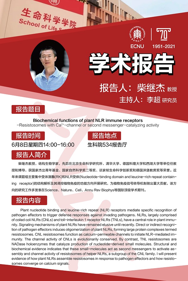 报告题目:Biochemical functions of plant NLR immune receptors-Resistosomes with Ca2+-channel or second messenger-catalyzing activity