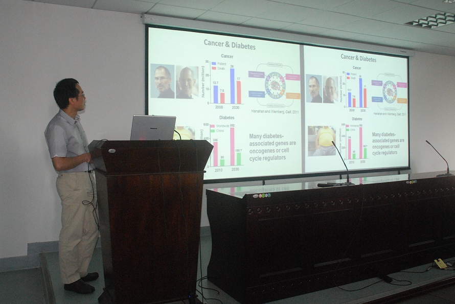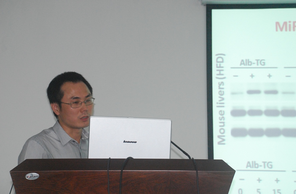 傅湘辉博士2004年博士毕业于协和医科大学基础医学院(医学分子生物学国家重点实验室),随后先后在欧洲和美国从事博士后研究,现为美国希望之城国家医学研究中心staff scientist,研究方向为表观遗传学在癌症和糖尿病中的作用及其机制研究。在此次报告中,傅博士向大家介绍了其所在课题组的研究领域,并详细介绍了微小核糖核酸MiR-26a在癌症、细胞代谢及代谢性疾病(如糖尿病)中的调控作用。MiR(MicroRNA)是一种虽小但十分特殊的内源性非编码RNA分子,序列非常短,大约由21-25个核苷酸组成。这些小的MiR通常靶向一个或者多个mRNA,通过翻译水平的抑制或断裂靶标mRNAs而调节基因的表达。至今为止,已经发现了3000多个MiR,其中大部分在动物体内都起着关键性的调控作用,是最主要的基因表达调控因子之一,据估计人体内大约2/3的基因都受到某个或某一组miR的调控。