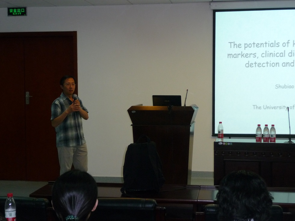 2013年8月20日,受我院张美玲博士的邀请,新英格兰大学高级研究员吴树彪博士在我校闵行校区生科院534报告厅为我院师生介绍了高分辨熔解曲线在核酸多样性、甲基化检测和医学诊断上的应用。吴树彪博士早年毕业于兰州大学,后在澳大利亚阿德莱德大学获得博士学位。吴博士的主要研究兴趣包括植物多样性的分子标记,重要农艺性状的遗传和QTL定位等。目前,吴博士担任多家国际著名生物类杂志的编辑和审稿人。