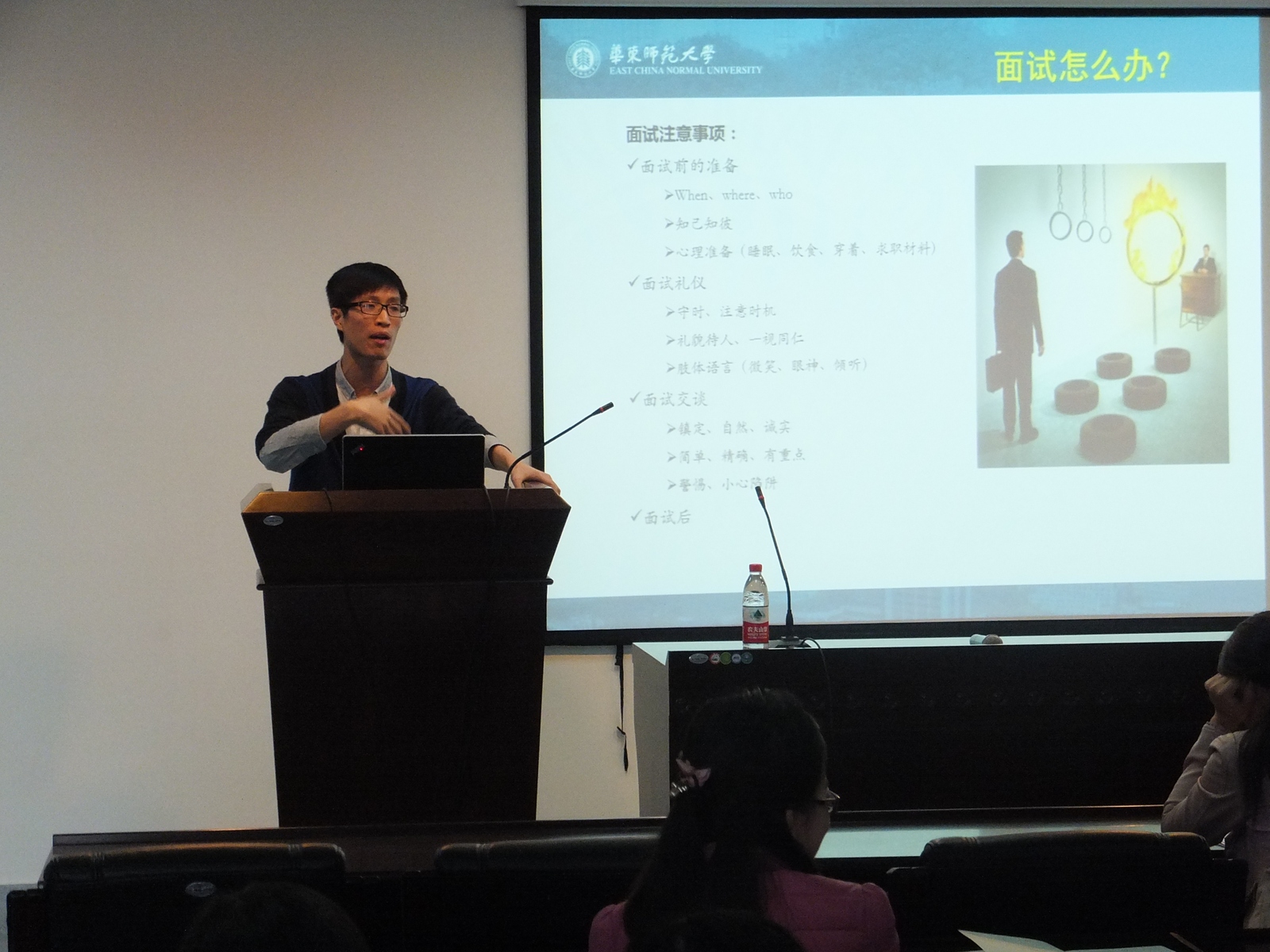 2013年11月12日,生命科学学院2013届毕业生“求职启航月”就业讲座之“成功求职——预备三部曲”在闵行校区生物楼534报告厅拉开序幕。本次讲座邀请到华东师范大学学生就业咨询服务中心陈旦峰老师,陈老师从求职的不同阶段为同学们介绍了求职中应注意的问题及相关技巧。生命科学学院党委副书记徐敏华老师出席本次活动,2011级研究生辅导员赵娟老师主持讲座。本次活动不仅吸引了毕业生的参与,更有许多二年级的研究生前来聆听。