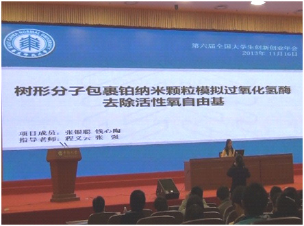 2013年11月16日,由教育部、科技部主办的代表我国本科生最高级别的学术会议——第六届全国大学生创新创业年会在中南大学举行,教育部高教司副司长刘桔和多位教育部、科技部的相关领导以及来自国内160余所高校的500多位师生参加了本次年会。经过相关学科专家联合评审和教育部专家组终审,有90篇学术论文入选本届创新年会,其中我院程义云教授、张强副研究员指导2010级本科生张银聪、钱心陶的论文《树形分子包裹铂纳米颗粒模拟过氧化氢酶功能》是我校两篇入围论文之一。