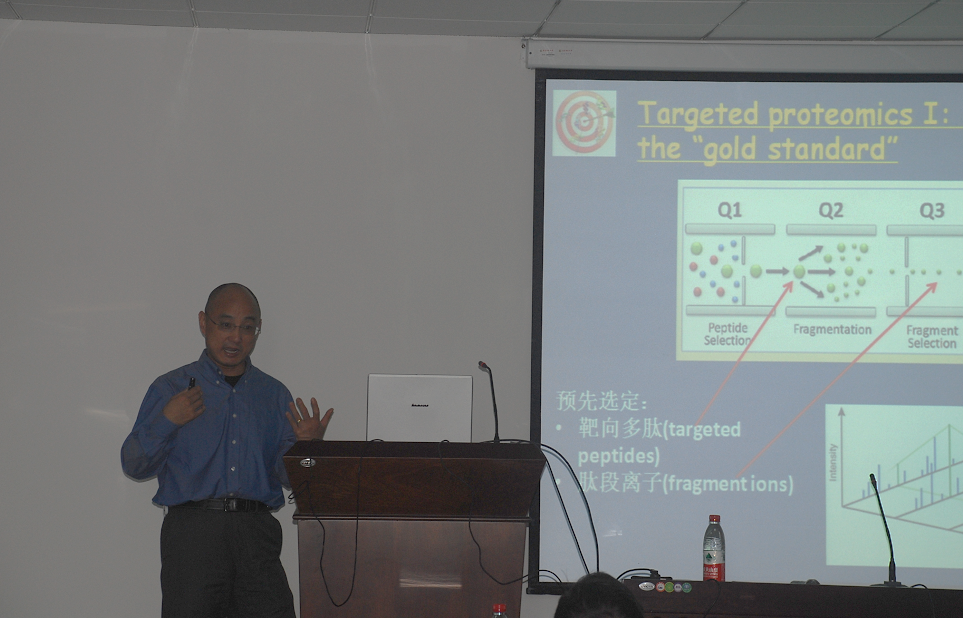 在长达一个多小时的报告中,严威研究员用幽默风趣的语言将枯燥的质谱专业术语化为生动形象的场景,让我们简单的了解了质谱的基本构造,原理及应用史。接下来严威研究员探讨了质谱综合兼顾蛋白质组学的技术研发及在生物医学上的应用,同时介绍了自己在基于质谱技术的定量蛋白质组学,尤其侧重于靶向蛋白质组学的方法学的研究进展,特别聚焦于研发定量精准并可高度重复的蛋白质组定量检测手段。他还介绍了他自己另一个研究内容是运用新一代质谱手段解析细胞表面膜蛋白的糖基化修饰和蛋白间的相互作用。最后严威研究员介绍质谱在生物医学转化应用上的进展:研发可用于诊断和伴随性治疗的蛋白质生物分子标记物。这些让在场师生获益匪浅。