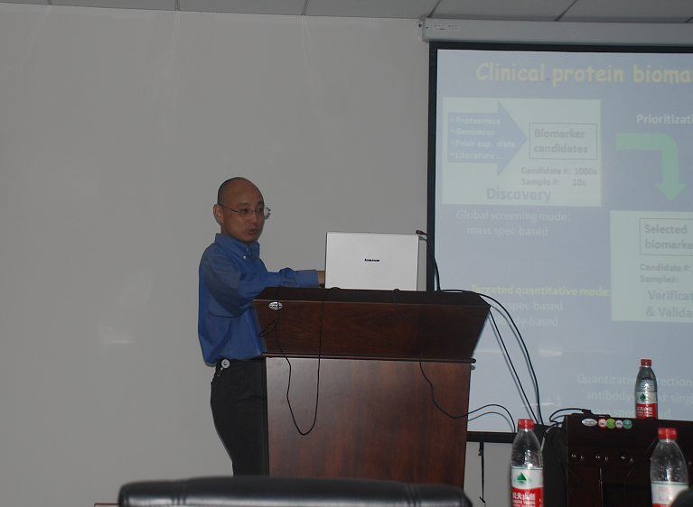 5月7日下午,我院廖鲁剑教授邀请著名定量蛋白质组学专家、上海交通大学系统生物医学研究院的严威研究员来校进行学术交流,并在我院534报告厅做了题为“有针对性的寻找临床生物标志物的策略”的精彩学术报告。