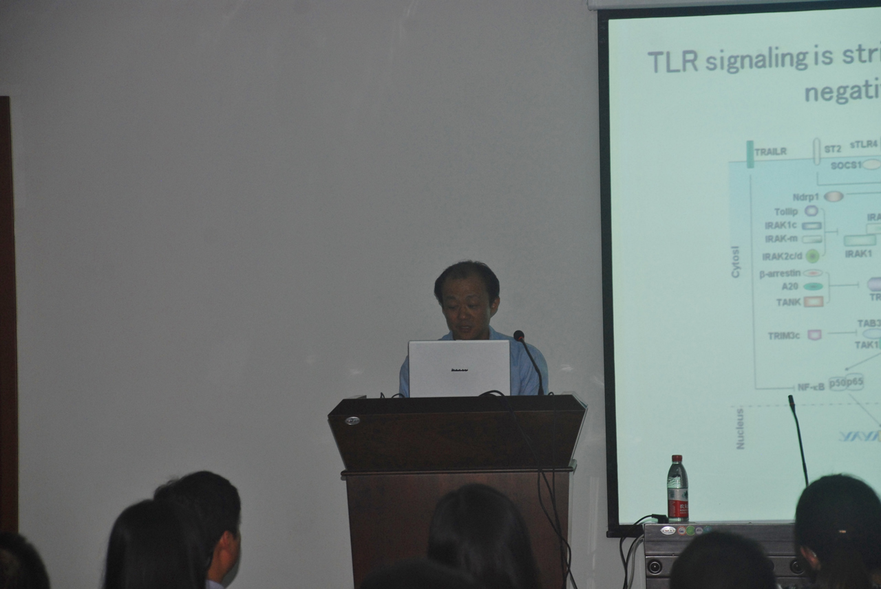本次报告会由江文正教授主持,我院部分师生参加了学术报告会。报告中,安教授首先介绍了固有免疫的发现历程以及其在机体免疫防御中发挥的重要作用,然后引出固有免疫中不可替代的识别分子TLR (Toll-like Receptor) ,TLR识别病原相关分子模式、介导炎症细胞因子的产生,在抗感染固有免疫反应中起重要作用。TLR信号转导负向调控的异常导致过量的炎症因子的产生,与脓毒血症以及其他多种炎症相关疾病的发生密切相关。接着,安教授介绍了蛋白磷酸酶SHP-2负向调节TLR3和TLR4激活的IFN-β表达的机制调控研究。SHP-2通过抑制TBK1活化的信号转导,负向调节TLR信号途径中TRIF介导的基因表达。最后,安教授详细介绍了目前课题组正在研究的有关STK38在脓毒败血症中的作用及其信号转导机制的最新研究进展。