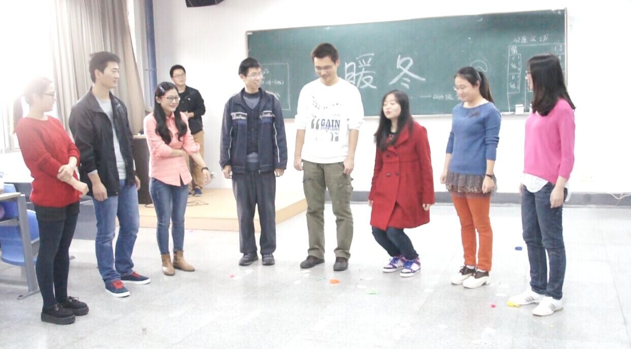 所幸的是,天气的不完美及地点的更改并没有影响到同学们的积极参与。活动主要分为游戏及才艺表演两大内容,在第一个游戏“五毛、一块”中,所有同学围成大圈,男生代表一块,女生代表五毛,在主持人报数之后,要在最短时间内凑成相应的数字,落单或凑错的人就会出局。现场的气氛随着这一游戏迅速升温,游戏的最后,将到场的同学都分成了6组,之后的游戏则按组参与。