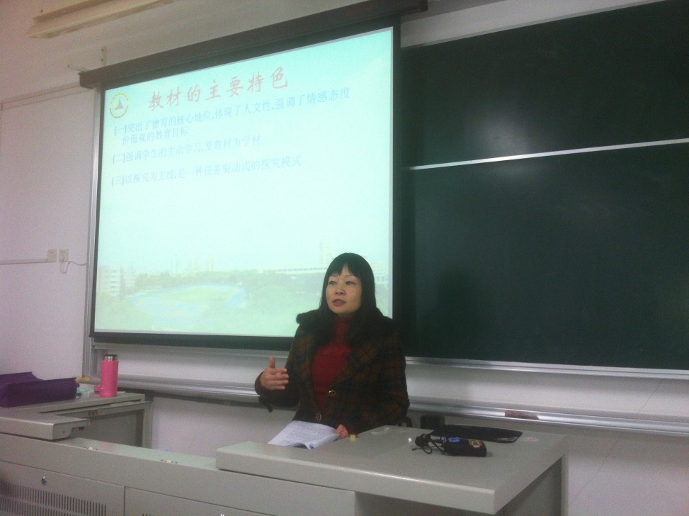 第二个阶段,是韩雁老师为我们带来的“《生命的基础》教材分析”的专题讲座,以高中教材《生命的基础》为例,为同学们讲解如何多角度、高效地进行教材分析。韩雁老师主要从教材的理念、内容框架、教材主要特色、以及所选主题在教材中的地位等方面,向大家详细介绍了教材分析的要点以及教案的设计过程,并举出了一些经典的案例方便大家理解,大家都听得非常投入、津津有味。在师生互动环节,同学们就自己面临的一些困惑与老师展开了交流,师生们相谈甚欢,使活动的气氛越发和谐与热烈。