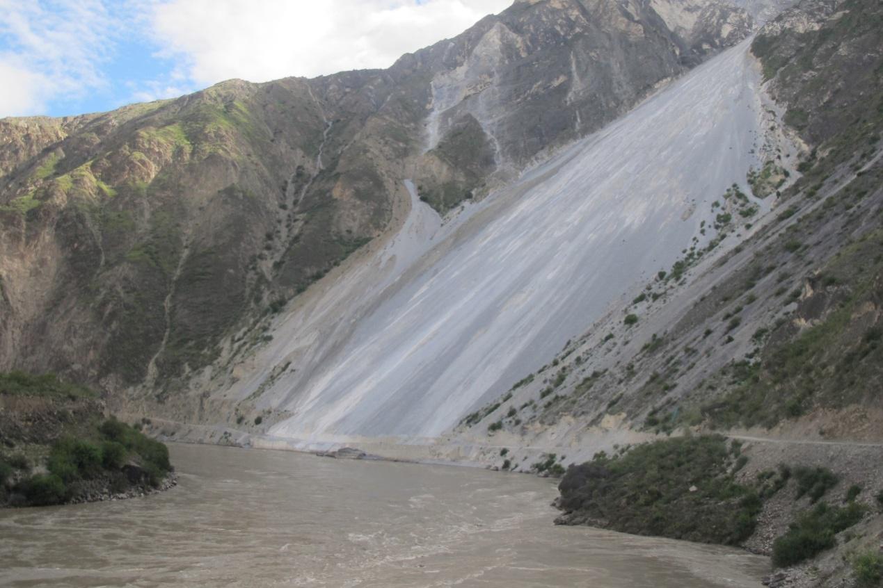 考察队返回波密县,为了在白天通过这段险路,车队决定加紧赶路。小心翼翼的行驶4个小时后,车队艰难通过通麦,大家一路上紧提的心总算稍稍有所放松。但是所有的事情就是在你意想不到的时候发生!就在大家高兴地商量晚饭吃点什么的时候,意外发生了。距离目的地2、3公里的地方发生碎石滚落,前面一辆车被砸,状况非常糟糕,交通完全中断。据维持秩序的藏族警官说需要等待来自135公里外的八一镇派出的急救车和消防车来处理事故,具体什么时间会到不清楚。此刻已是北京时间18点半,我们被堵在了通麦天险最险峻的一段路——排龙天险。上百辆的车停靠在只有几米宽、近百米高的山体挖出的一段土路上,头顶都是巨大的岩石,路边则是垂直向下几十米的崖壁,盘旋着无数漩涡的雅鲁藏布江卷动的黄色江水滚滚向东。此时,为了明天的科考任务,考察队决定派出王健老师及一名研究生同学携带对讲机徒步先行,一方面为了查看道路情况,另一方面尽快找到食宿地点。大家目送他们的身影渐渐被夜幕包裹,没有终点的漫长等待开始,气氛则越来越紧张,恐惧也悄然而生。大家心照不宣地抬头默默注视着上方,密切关注头顶上随时可能落下的危石。