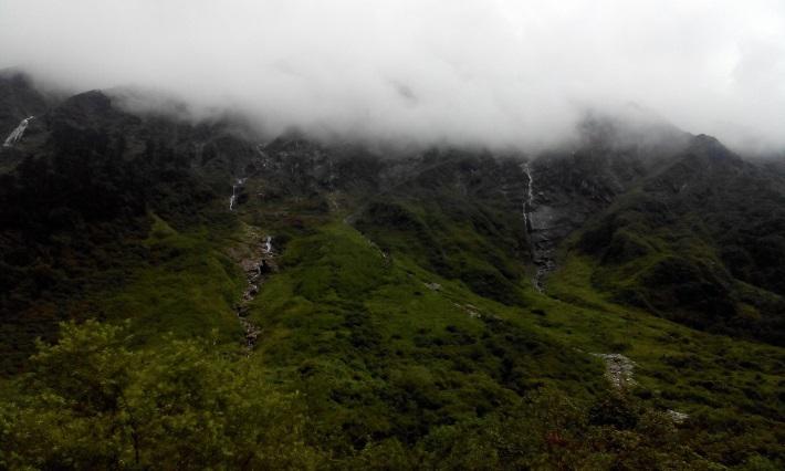 25日清晨,大家整顿精神,墨脱!我们来了。车队来到嘎隆拉隧道前驻足时,这个从1961年就开始勘测,近四十年的停停修修,2008年才真正动工,2010年贯通的隧道已经让墨脱县告别了唯一不通公路的县的历史。大家不禁感叹祖国的发展为人民生活带来的变化,也更加让我们热爱我们的祖国。车队在此停留2个小时,一方面考察高海拔地区的植被情况,另一方面也是体验一下高海拔徒步中大家的体力和毅力。2小时后最后的冲刺开始了,3公里黑漆漆的嘎隆拉隧道没有让人感到压抑和紧张,反而大家更加期待见到阳光后的景色该是怎样?一缕光线照亮了前面的视野,雾气腾腾盘山路,雾气散去我们不仅有些许失望,和隧道那边没有什么区别,也没有我们想象中的热带雨林。车队突然停了,52K检查站,不一会儿一个坏消息传来,因为近日的降雨,距离波密48K的地方发生塌方,其余还有十余处小塌方,人员车辆都无法通行,道路抢通的时间不知道,墨脱这位含羞的少女以她特有的方式婉拒了我们的拜访。古有蜀道难,难于上青天,今进墨脱难,难于上青天。