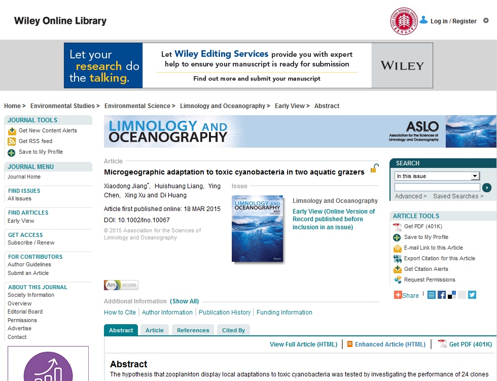 我院浮游动物研究小组利用地理马赛克理论,分析了蓝藻水华区与非水华区浮游动物对产毒蓝藻的抗性地理变异。研究发现,浮游动物发生了明显的种群分化,每个地理种群对产毒蓝藻的抗性与该生境中蓝藻水华强度显著正相关,形成“局域适应”现象。而且这种适应可以发生在微地理尺度上,在10公里的尺度上浮游动物种群就能呈现适应性变异。