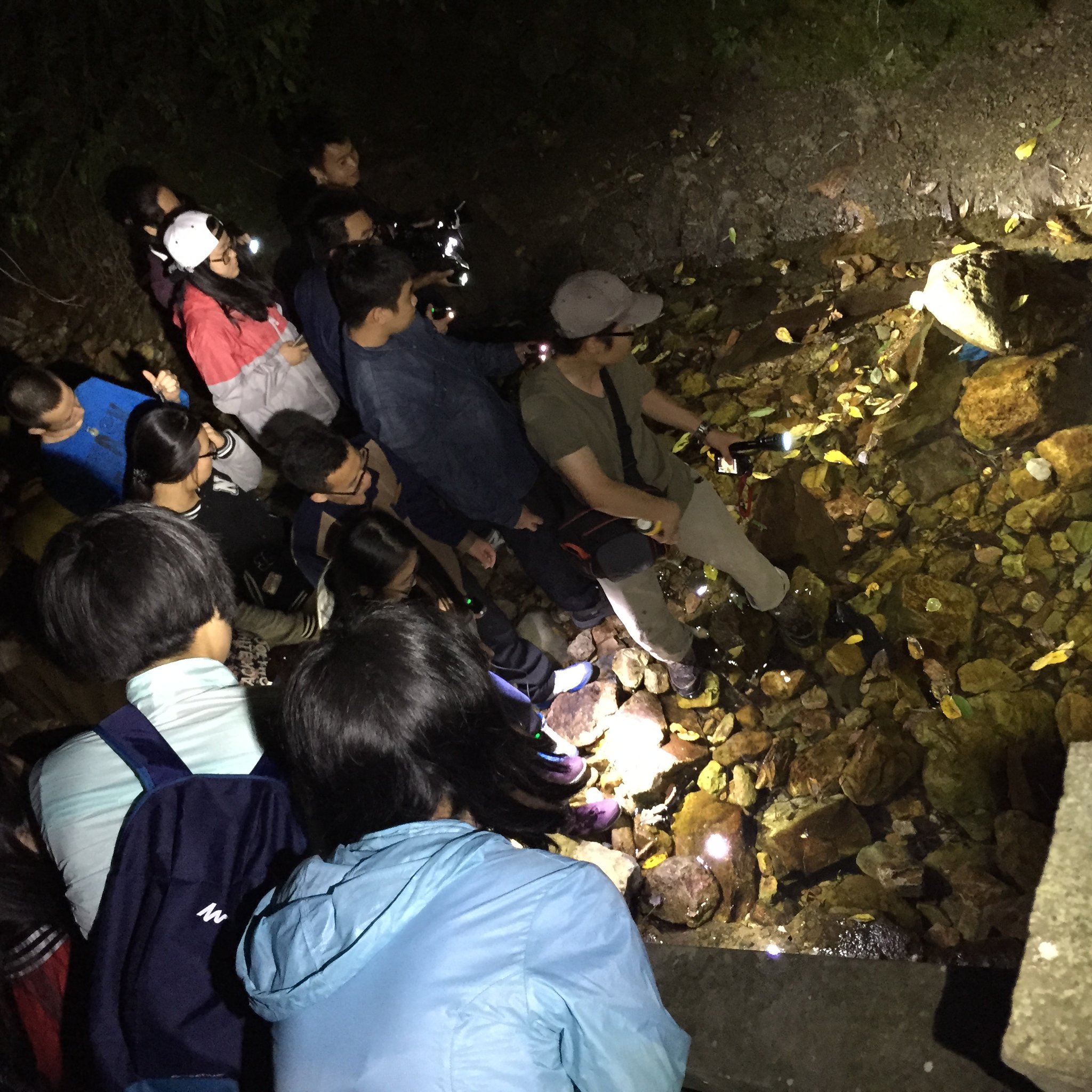 除了上述四项日间动物学实习内容外,同学们还有幸跟随老师们进行了夜间动物调查。夜幕降临,月华笼罩之时,同学们手拿电筒,头带顶灯,穿梭于丛林与溪流之间,听声声蛙叫,闻窸窣虫鸣。借助道道刺破黑暗的灯光,大家看到了一个与白昼迥然相异的夜间世界。种类繁多、模样奇异的蛙与蜥蜴,令人畏惧却又好奇的高冷蛇类,还有在夜晚才纷纷现身的蝙蝠和壁虎,无一不令同学们倍感新奇,更深刻地领悟了大自然的博大美好、神秘醉人。