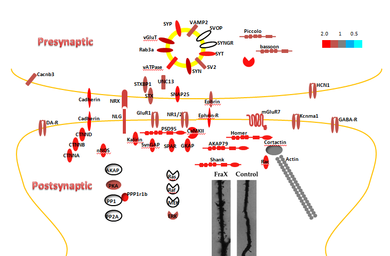 在这项研究中,研究人员分别比较幼年和成年的fmr1野生型和敲除小鼠神经突触组分的蛋白表达谱。结果表明,在FMRP敲除的幼年小鼠中,有上百个蛋白的表达量上调,在成年鼠中则上调不明显。 这些上调的蛋白与突触的形成,突触的重塑,大脑的发育,智力障碍以及自闭症有关。 比较FMRP已知的靶mRNA和自闭症的易感基因,可以发现有很大的相关性。