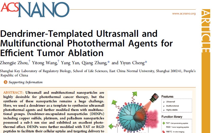 2016年4月7日,美国化学会顶级刊物ACS Nano(影响因子12.881)在线发表了华东师范大学生命科学学院,上海市调控生物学重点实验室张强副教授等人的最新研究成果(http://dx.doi.org/10.1021/acsnano.6b02058),论文题目为“Dendrimer-Templated Ultrasmall and Multifunctional Photothermal Agents for Efficient Tumor Ablation”,该工作利用树形高分子为模板合成了多功能超小光热材料,并成功实施了多模态成像介导的靶向光热治疗。