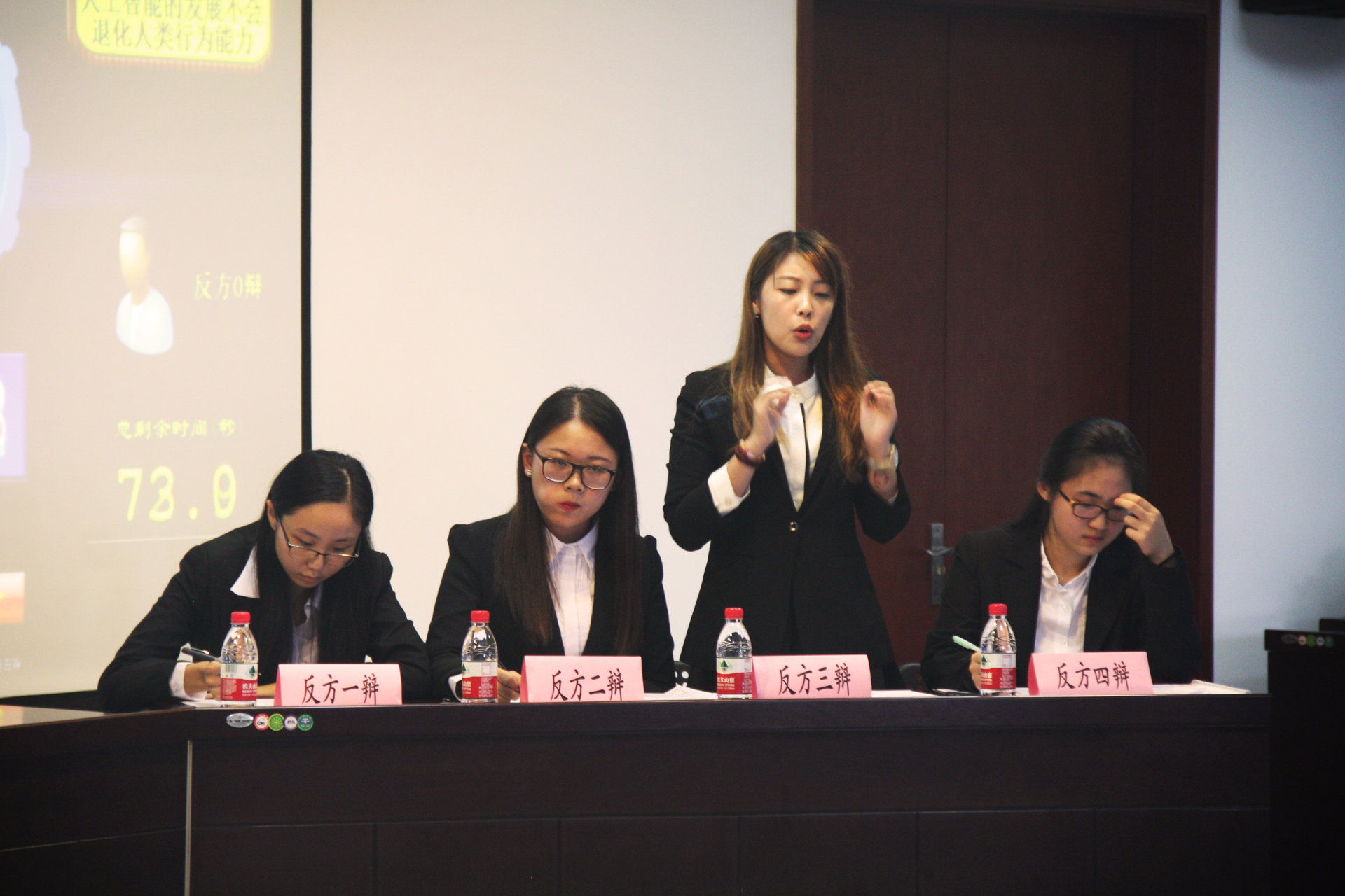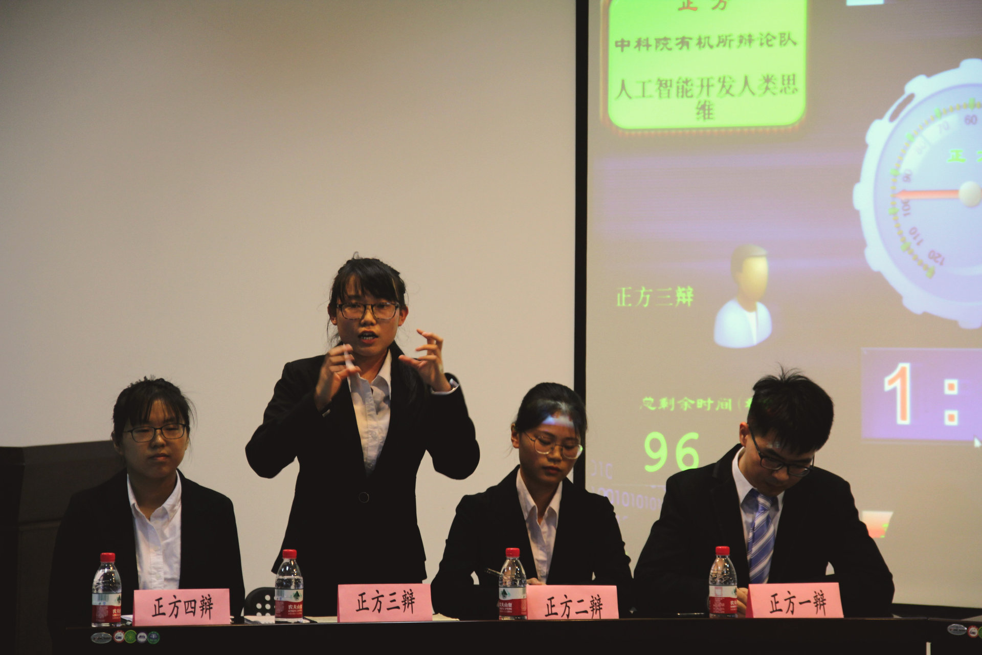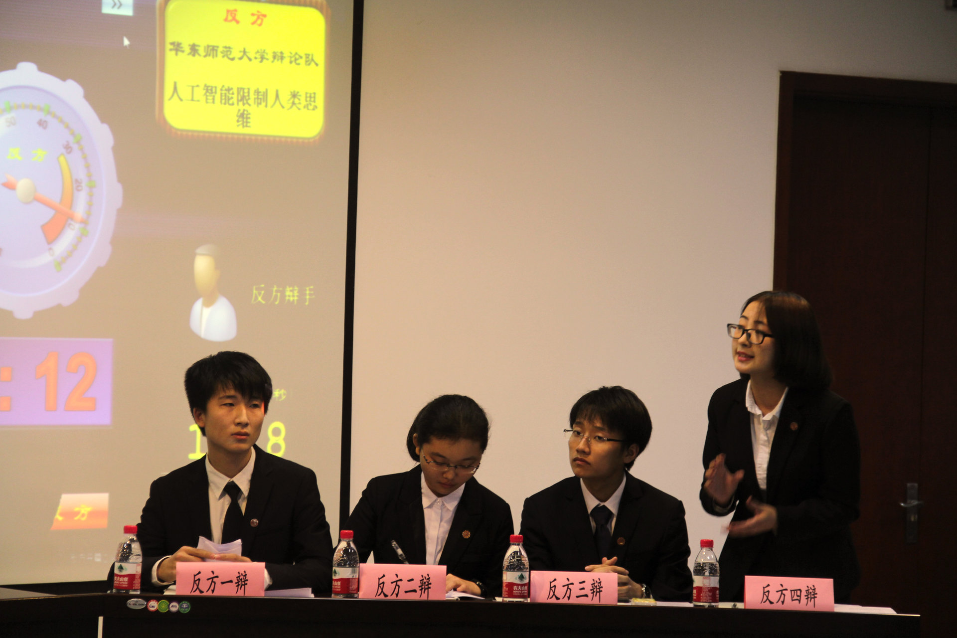 本轮比赛分为上下两场,上半场辩题为“人工智能的发展会不会退化人类的能力”,参赛双方为正方华东师范大学辩论队对阵反方上海交通大学辩论队。下半场辩题为“人工智能开发or限制人类思维”,参赛双方为正方中科院有机所辩论队对阵反方华东师范大学辩论队。