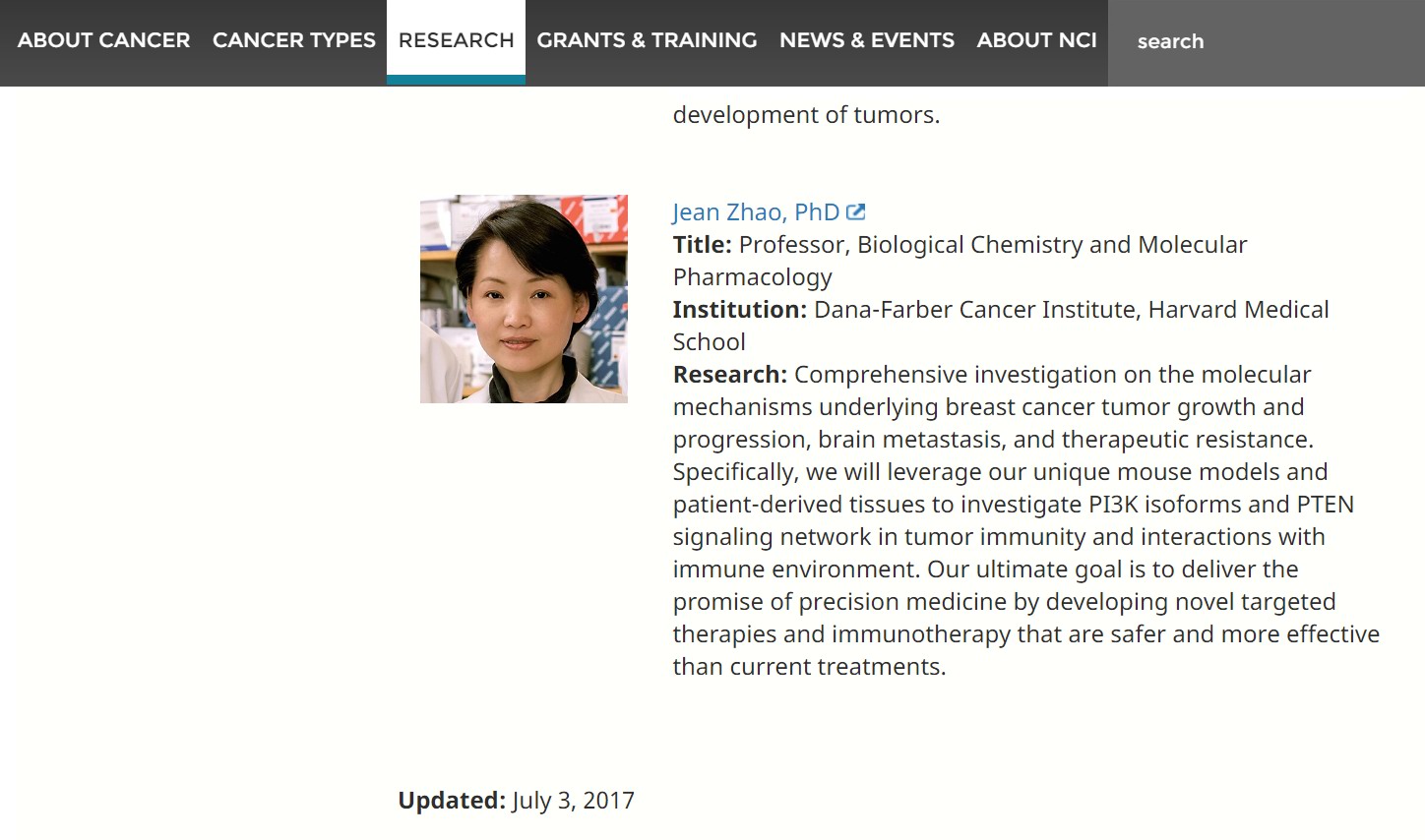 赵景教授1984年本科毕业于华东师范大学生物学系,1999年获得美国Tufts University School of Medicine分子生物学与微生物学博士学位,之后在哈佛大学医学院达纳法伯肿瘤研究所从事博士后研究。现任哈佛大学医学院化学生物与分子药理学终身正教授,博士生导师,哈佛-达纳法伯乳腺癌中心领导人, 达纳法伯肿瘤院研究院执行委员会核心成员, 美国癌症研究协会年会科学委员会联合主席, 美国国家脑肿瘤学会委员会顾问, 美国国立卫生研究院分子靶标和癌症治疗研究部评审专家,美国国防部乳腺癌研究评审专家,美国国家脑肿瘤学会科学顾问。