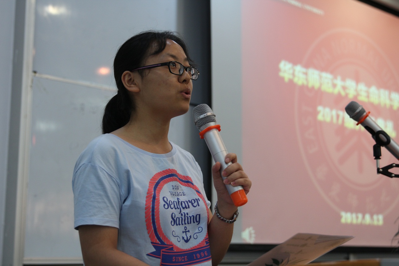 新生代表发言环节,2017级硕士韦旭表示已经在华东师范大学生命科学学院度过了本科四年,并多次获得国家特等奖学金等荣誉,在硕士研究生阶段依然选择了华东师范大学,只因为深情依恋着丽娃河边这所让她不仅收获了理性的思维,也感受到人文温度的美丽学府。她还从提高创新能力,坚持学术诚信,遵守实验室安全规则等方面代表2017级新生做出了承诺。