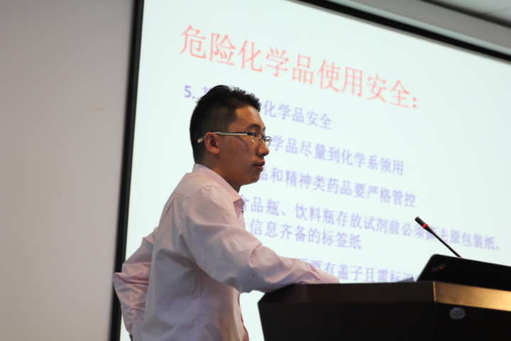 实验室常规安全教育环节上,学院实验室安全负责人刘碧胜从仪器设备的使用安全、用电安全、危化品安全、生物安全等角度系统全面地为学生讲解了基本的实验室安全知识以及遇到安全事故如何处理等问题。随后他又讲解了公共区域精密实验仪器的规范操作,强调每个学生都有责任维持公共安全秩序和保持公共环境卫生,共同营造干净舒适的实验环境。