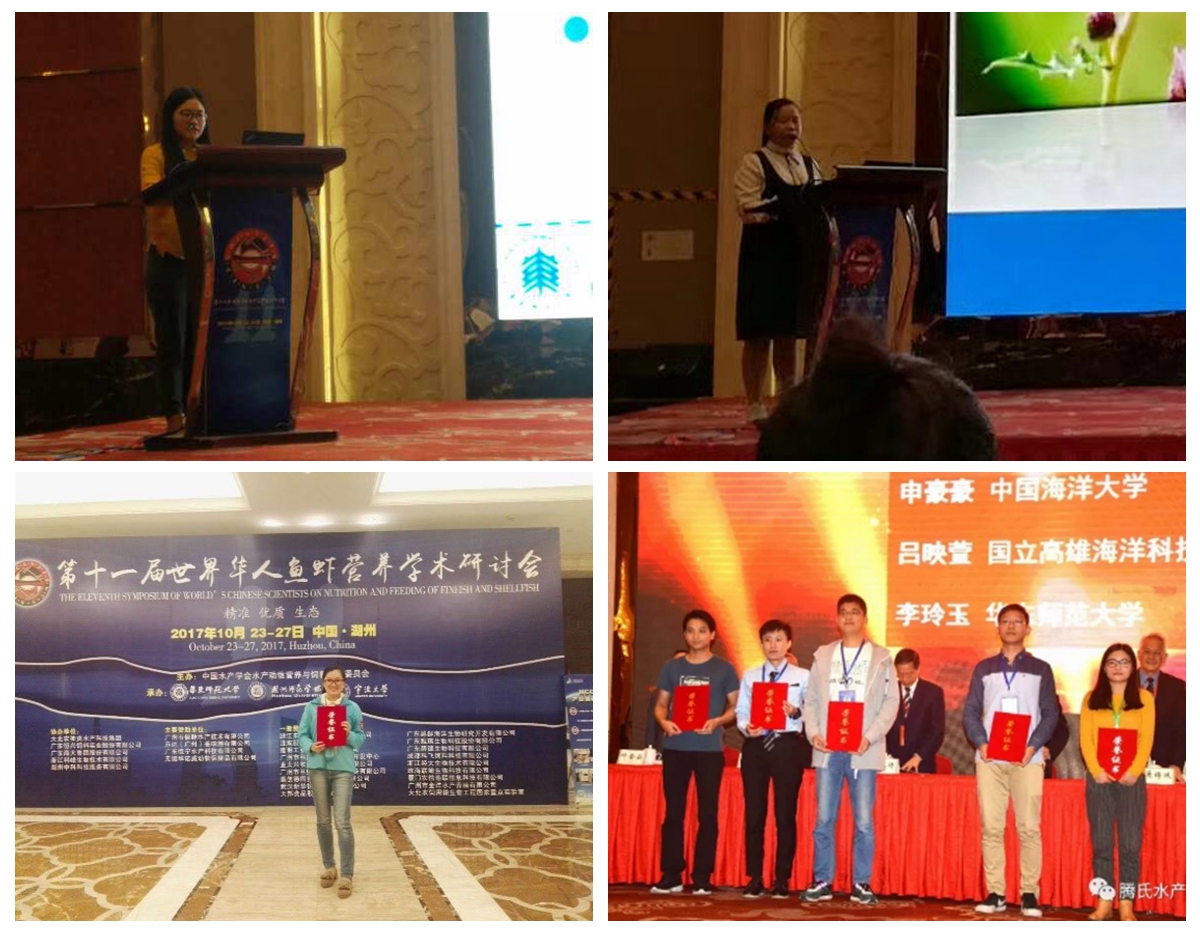 大会期间,我校水生动物营养与健康实验室表现突出,共有8位师生在不同专题中做口头报告,6位同学展示了精美的墙报。其中,杜震宇教授做《皮下脂肪—一个不能被鱼类营养学研究忽视的生物组织》报告,张美玲教授做《高脂饲料促进罗非鱼脂肪积累的肠道微生物机制研究》报告,李东亮老师作《斑马鱼ghrelin基因敲除导致脂肪代谢调控的改变》报告、王晓丹老师作《广盐性鱼类渗透调控元件研究》、博士研究生焦建刚作《草鱼和罗非鱼对n-6和n-3系脂肪酸的细胞代谢机制差异》、博士研究生徐畅作《两种脂水平饲料中添加不同浓度的硫辛酸对中华绒螯蟹生长表现、体成分、抗氧化状态及脂质分解代谢的影响》报告,博士研究生李玲玉和硕士研究生刘爽则分别在研究生论坛上作《抑制脂肪酸β-氧化损伤尼罗罗非鱼的免疫力》和《饲料中不同水飞蓟素水平对中华绒螯蟹的生长、体成分和抗氧化能力的影响》报告。我院LANEH实验室的系列报告,角度新颖、数据详实、技术先进,不少内容代表了当今国际水产动物营养领域最前沿的研究水平,获得了全体与会代表的一致好评与极大的关注。其中,李玲玉获得本届世华会“研究生论坛优秀报告奖”,博士研究生马倩倩同学和已毕业的周利硕士获得“最佳墙报奖”。