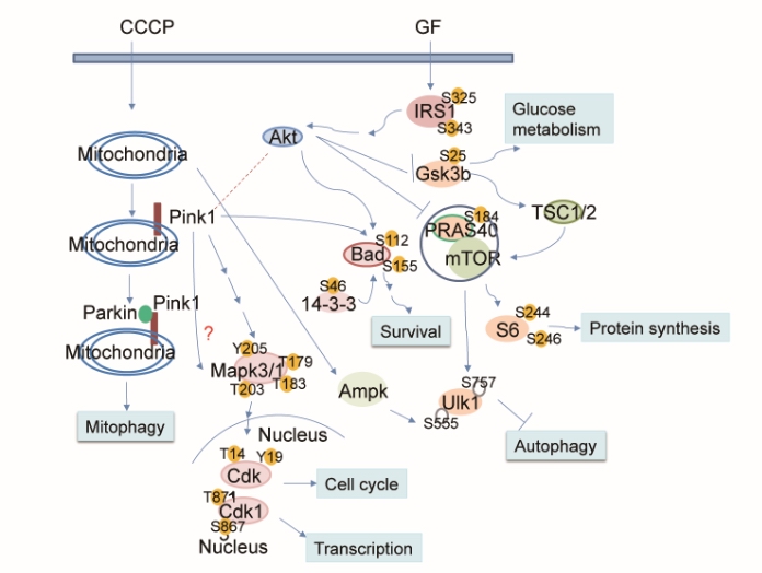 2017年12月12日, Cell Death and Differentiation杂志在线发表了华东师范大学生命科学学院、生命医学研究所廖鲁剑研究组的最新研究工作“Analysis of neuronal phosphoproteome reveals PINK1 regulation of BAD function and cell death.”。博士研究生万慧达和其他研究组成员在廖鲁剑教授的指导下,以野生型(WT)和PINK1基因突变型( KO)小鼠原代神经元为研究对象,利用基于质谱的大规模定量磷酸化蛋白质组方法描绘了线粒体轻微损伤过程中蛋白磷酸化的动态图谱,发现了磷酸化水平发生变化的这些蛋白质主要富集在mTOR,neurotrophin signaling和insulin signaling三条激酶信号通路。进一步通过体内外实验验证了PINK1可以直接磷酸化促凋亡蛋白BAD 的第112位和136位的丝氨酸(Ser112, Ser136),磷酸化抑制BAD线粒体定位,从而抑制凋亡复合体形成,避免细胞色素c的释放进而阻止细胞凋亡,因此PINK1通过直接调控促凋亡蛋白BAD的磷酸化状态来调控神经元的存活。