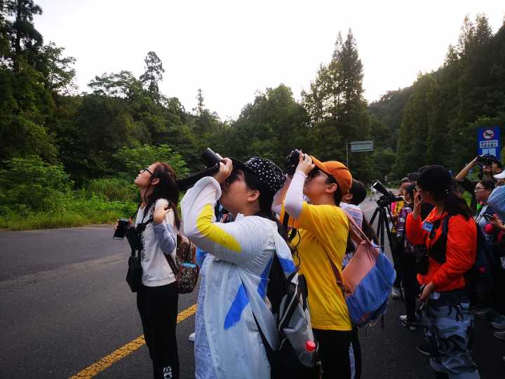 鸟类野外生态学观察也为同学们的实习留下了浓墨重彩的一笔,天还没亮,5点不到同学们已经起床,在薄顺齐老师的带领下从住处一路往上来到了禅源寺,前后在公路旁、竹林里、小溪边、农田处等不同生境对鸟类进行了观察。借助双筒与单筒望远镜大家看到了一个不同寻常的鸟的王国。