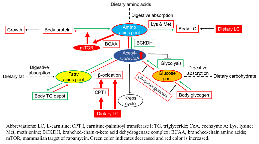 上图说明:肉碱在鱼类营养代谢中的综合调控机制