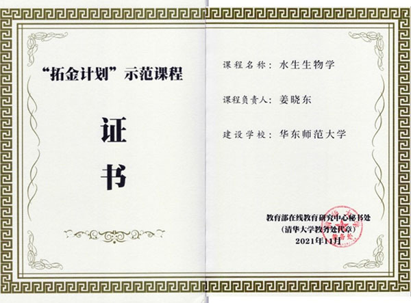 近期,我院《水生生物学》课程成功入选教育部在线教育研究中心“拓金计划”首批示范课程,在学堂在线平台面向全国教师开放展示。《水生生物学》综合运用国际优秀教材、高水平学术论文和在线教学平台,构建了一体化的混合教学策略和多元化的课程评价体系。课程引入游戏闯关理念,开发出闯关式测验。课程引入分享理念,开发出分享式阅读。课程引入学术交流理论,开发出基于Nature和Science论文的研讨式报告。课程荣获2020年国家级线上线下一流本科课程、2019年首届全国高校混合式教学设计创新大赛一等奖、2018年上海市精品课程等荣誉。