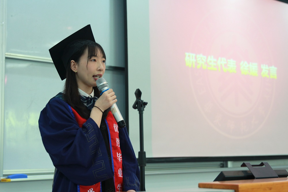 优秀毕业生代表硕士研究生徐媛、本科生贾智文依次发言。徐媛分享了自己在生命科学学院求学七年的收获与成长,在今后的道路上她将时刻谨记师大“求实创造,为人师表”的校训,以最饱满的热情去勇敢面对各种挑战。